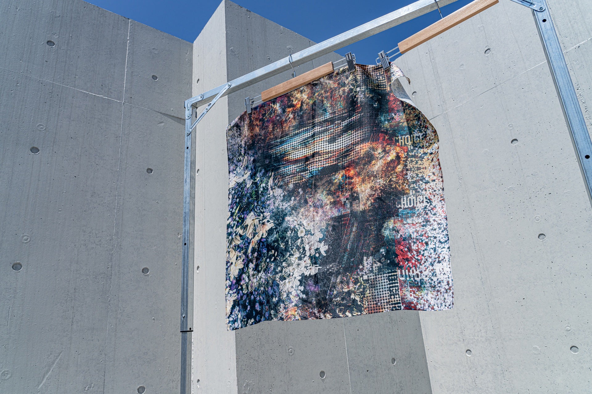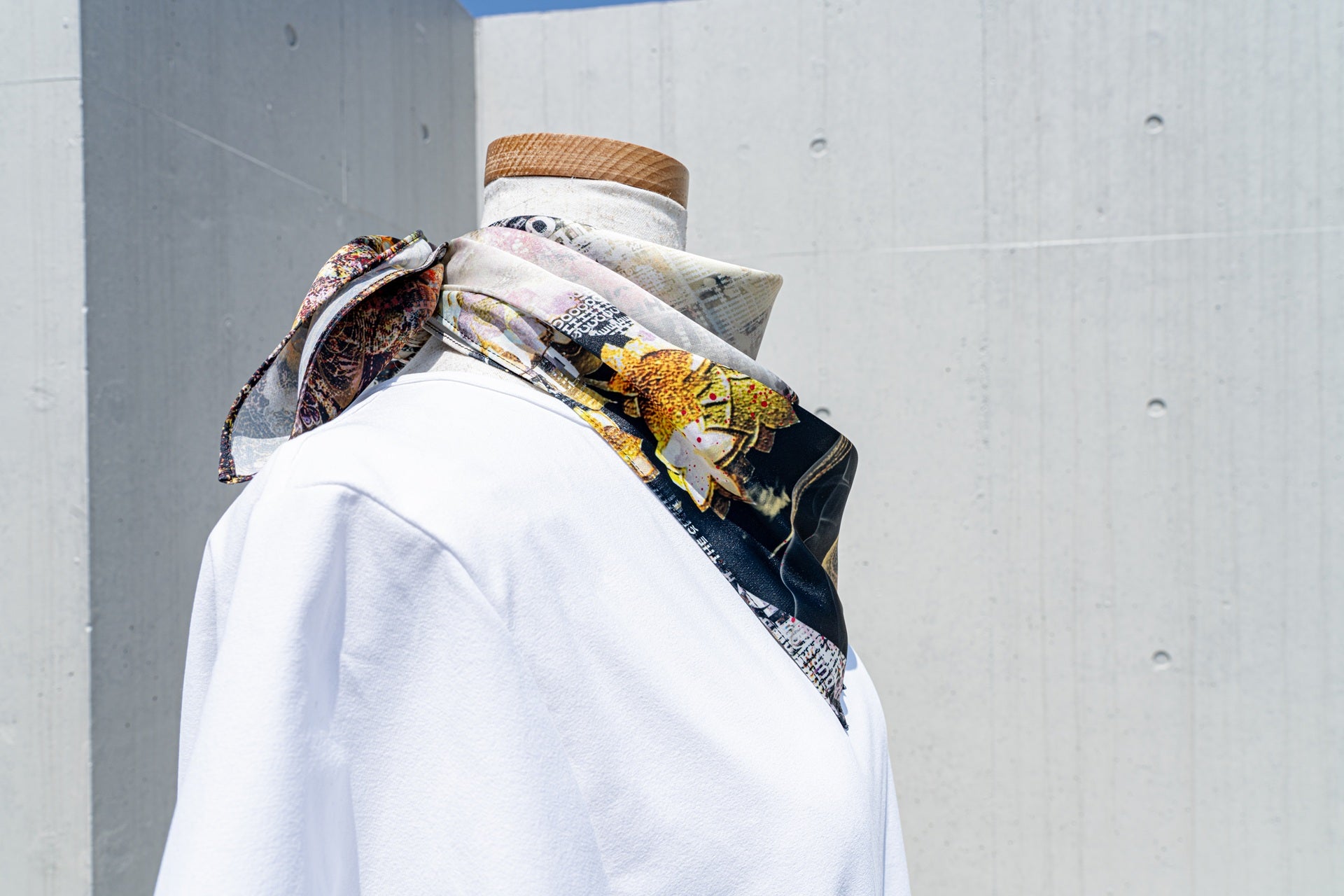 グラフィックを全面に印刷した多用途スカーフ。