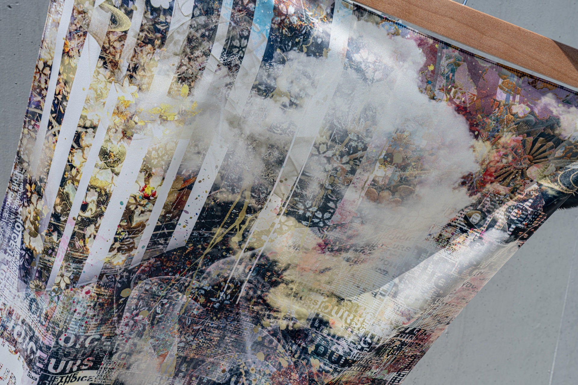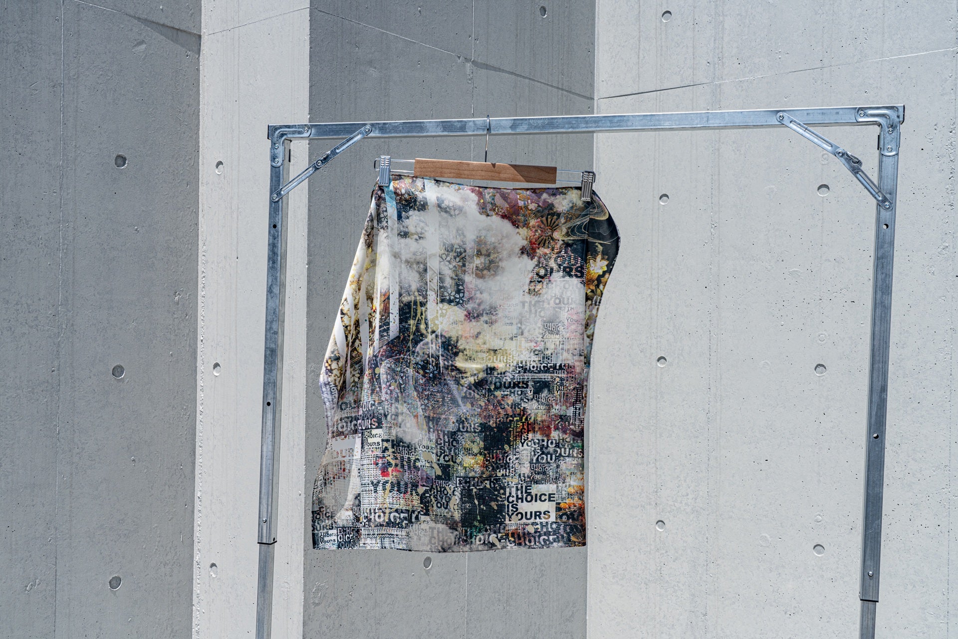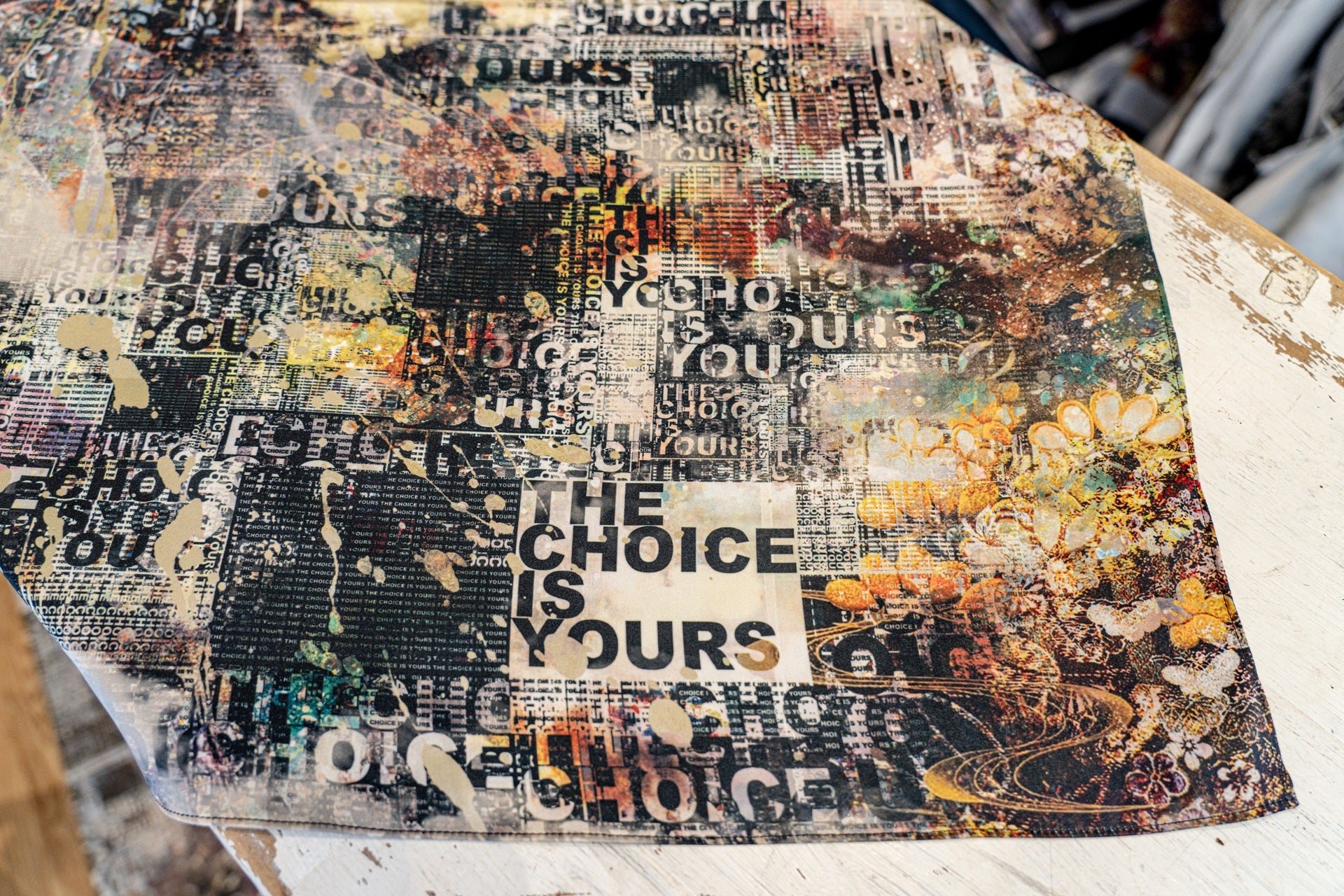 グラフィックを全面に印刷した多用途スカーフ。