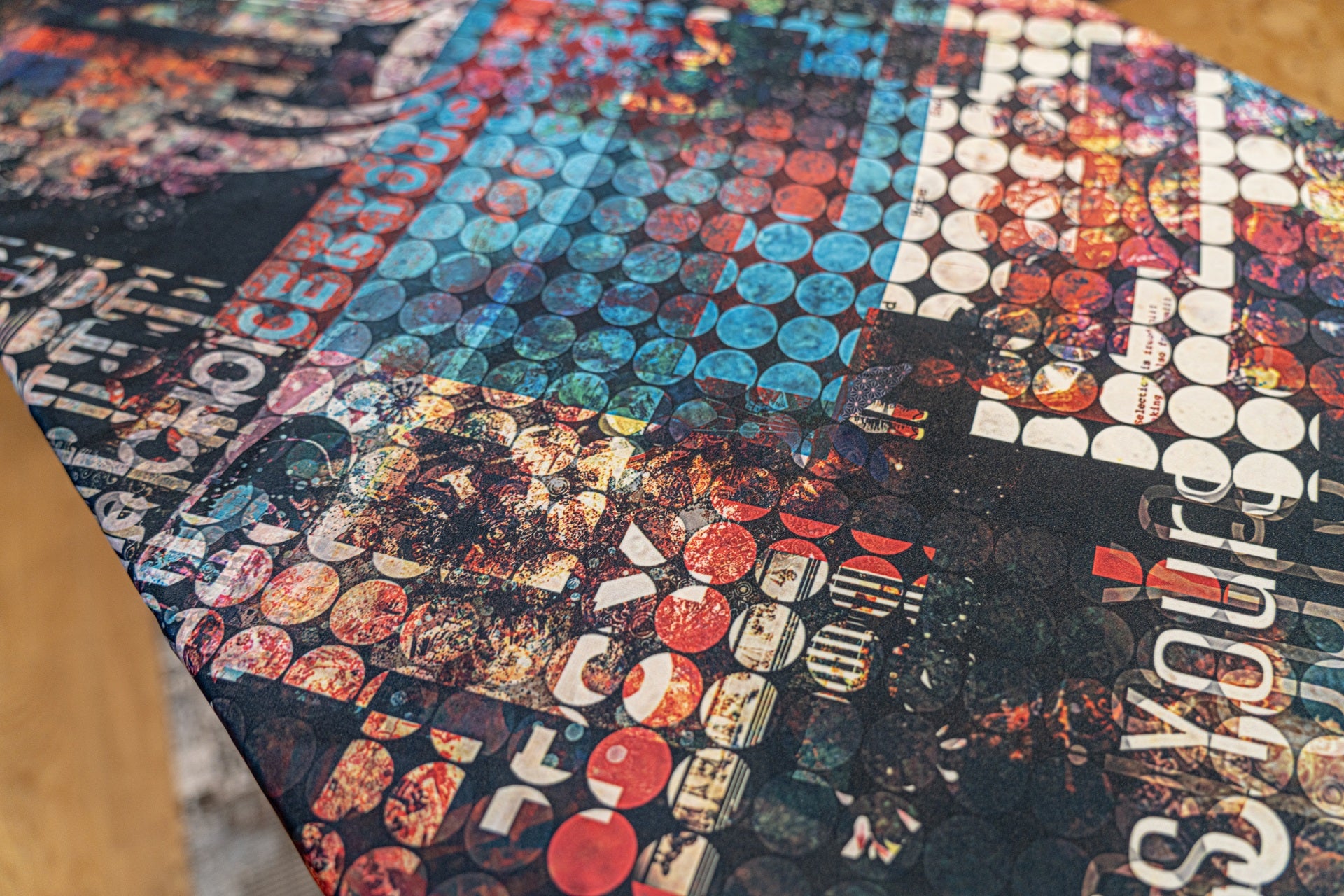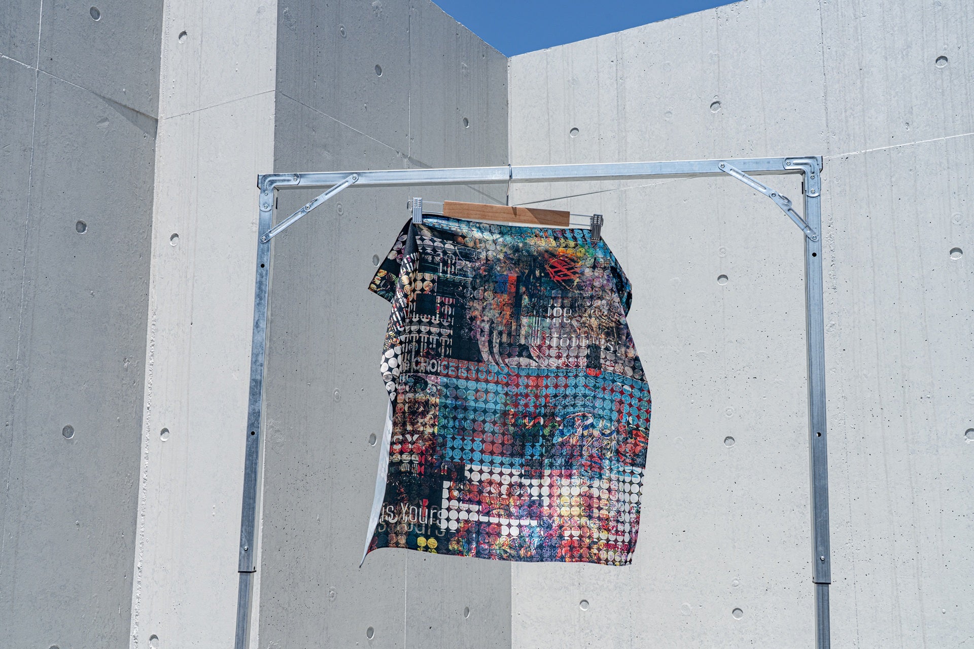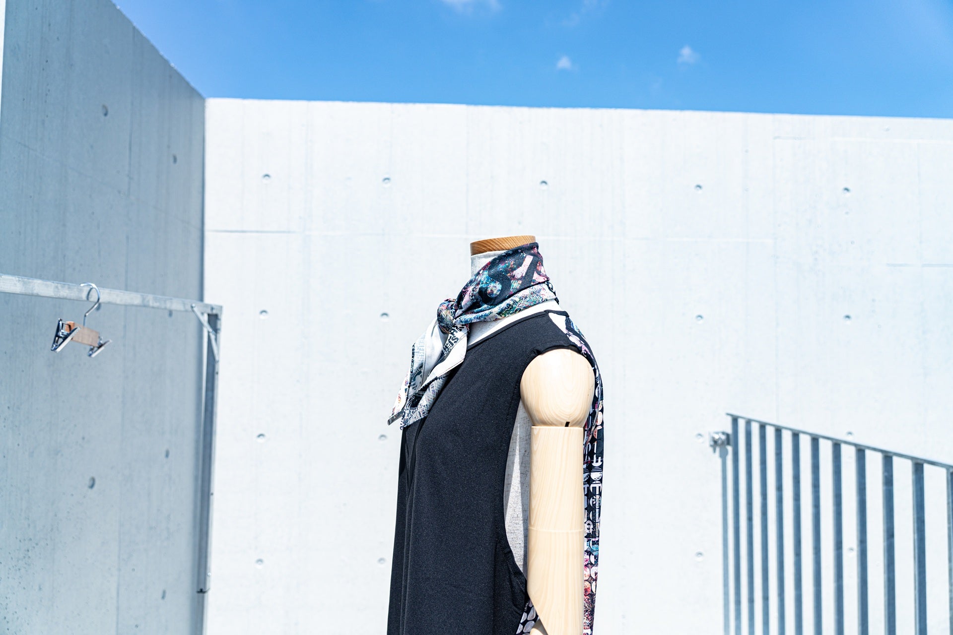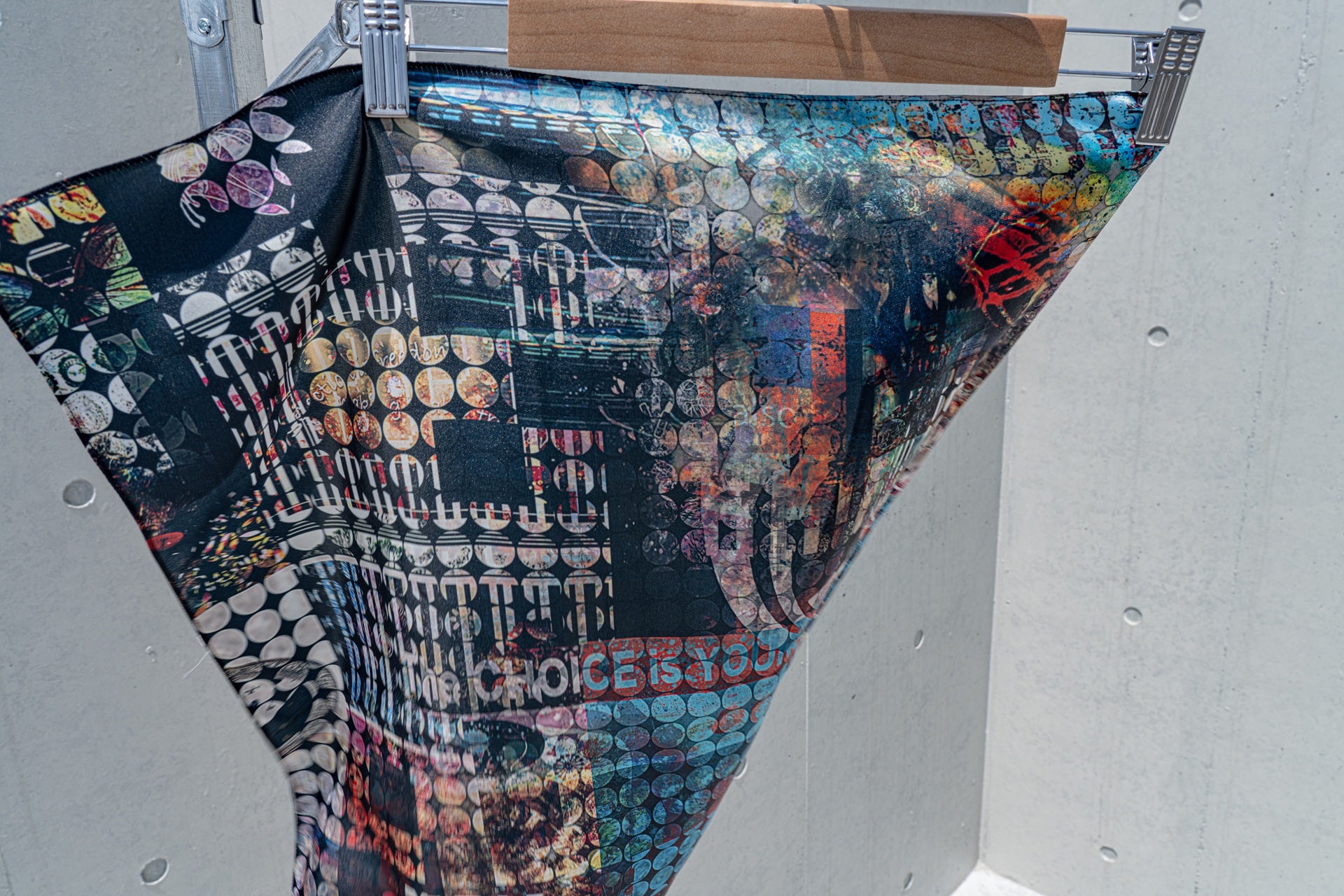 グラフィックを全面に印刷した多用途スカーフ。